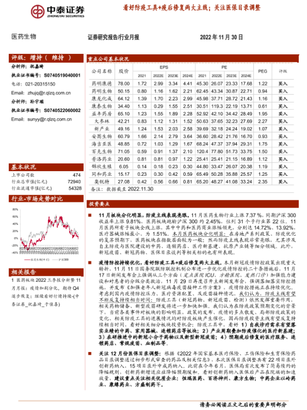 【中泰证券】【20221130】医药生物行业月报:看好防疫工具+疫后修复两大主线;关注医保目录调整-17页