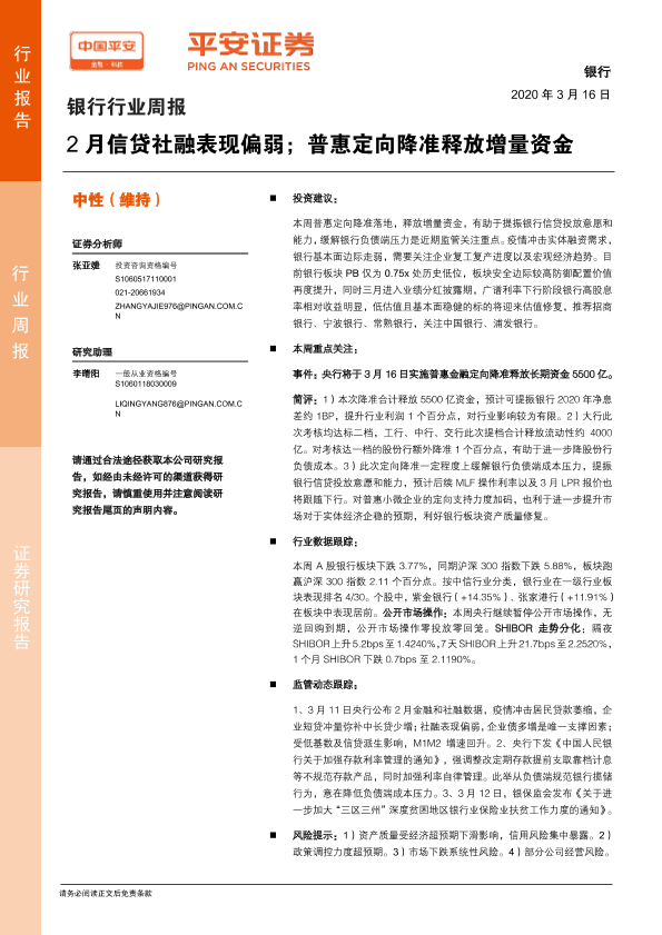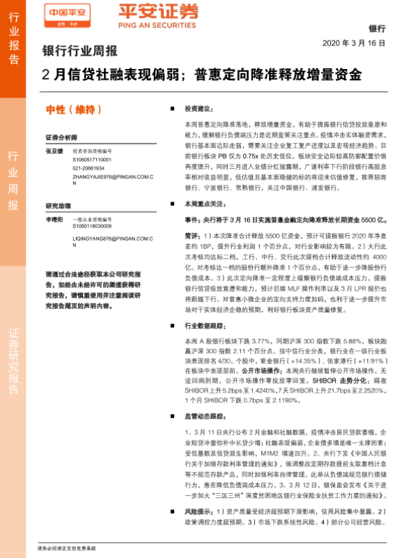【平安证券】【20200316】2月信贷社融表现偏弱;普惠定向降准释放增量资金-6页