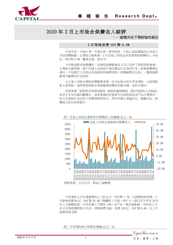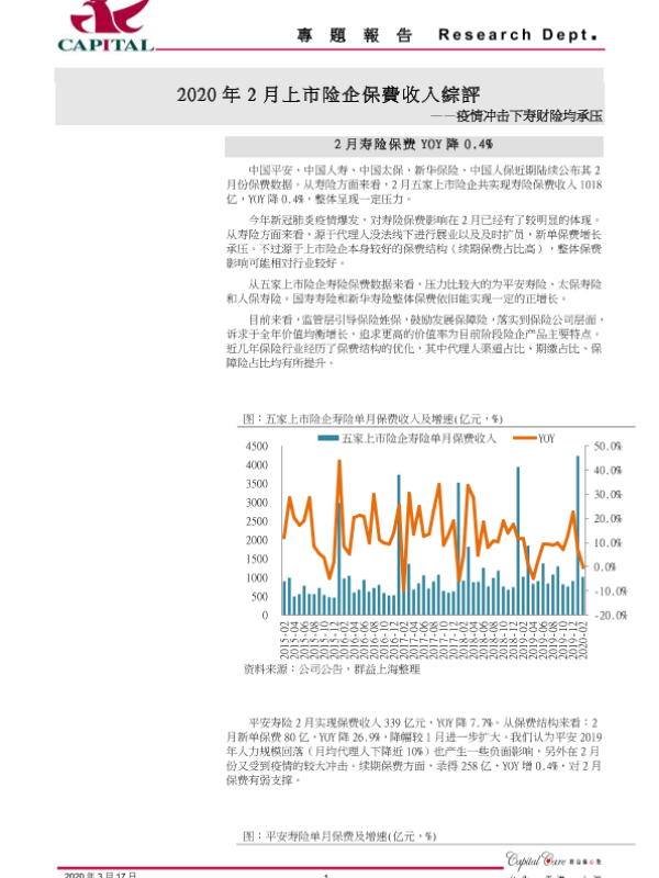 【群益证券】【20200317】2020年2月上市险企保费收入综评:疫情冲击下寿财险均承压-8页
