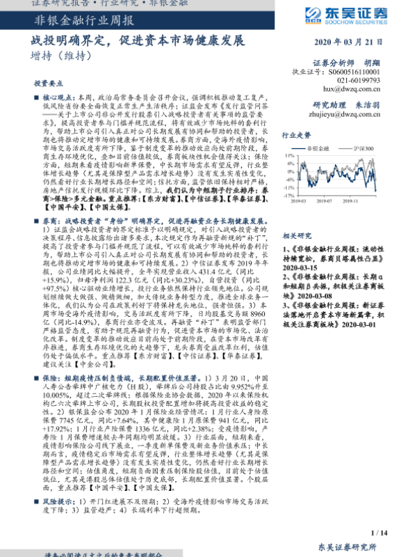 【东吴证券】【20200321】非银金融行业周报:战投明确界定,促进资本市场健康发展-14页