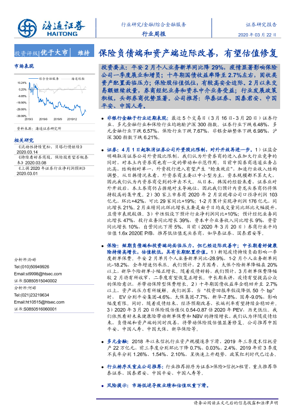 【海通证券】【20200322】综合金融服务行业周报:保险负债端和资产端边际改善,有望估值修复-8页