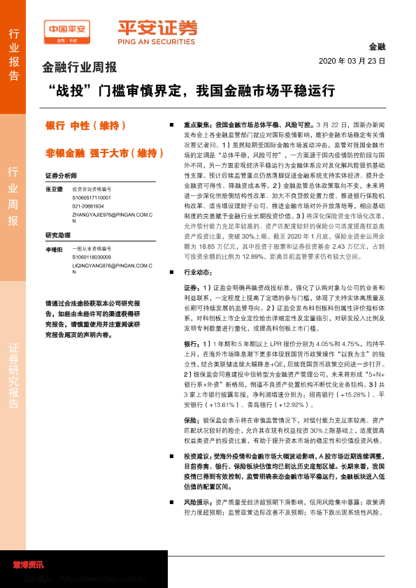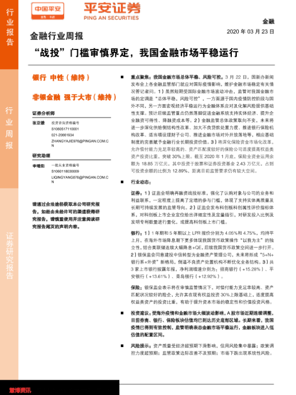 【平安证券】【20200323】金融行业周报:“战投”门槛审慎界定,我国金融市场平稳运行-8页