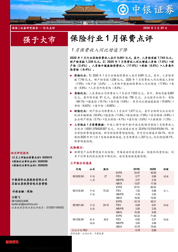 【中银证券】【20200325】保险行业1月保费点评:1月保费收入同比增速下降-3页