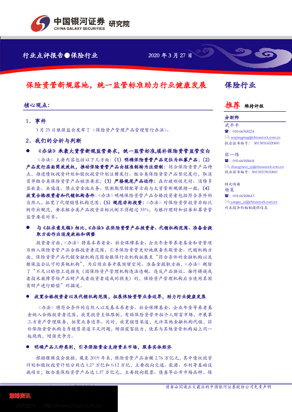 【银河证券】【20200327】保险资管新规落地,统一监管标准助力行业健康发展-4页
