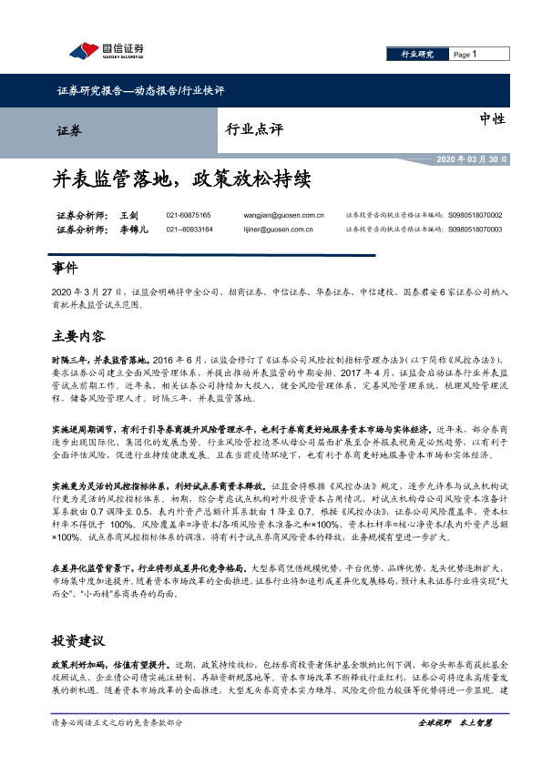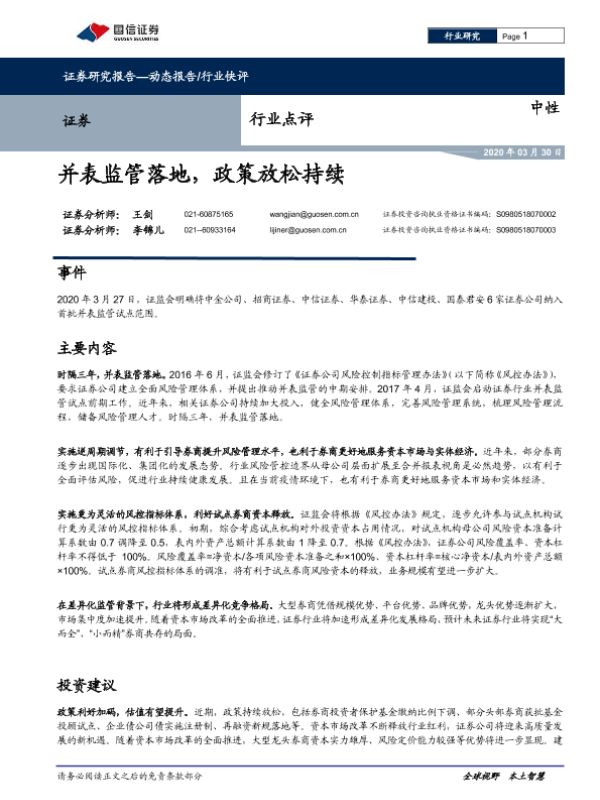 【国信证券】【20200330】证券行业点评:并表监管落地,政策放松持续-4页