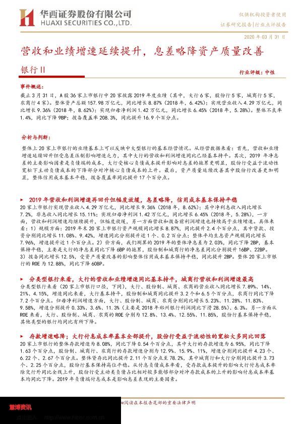 【华西证券】【20200331】银行:营收和业绩增速延续提升,息差略降资产质量改善-4页