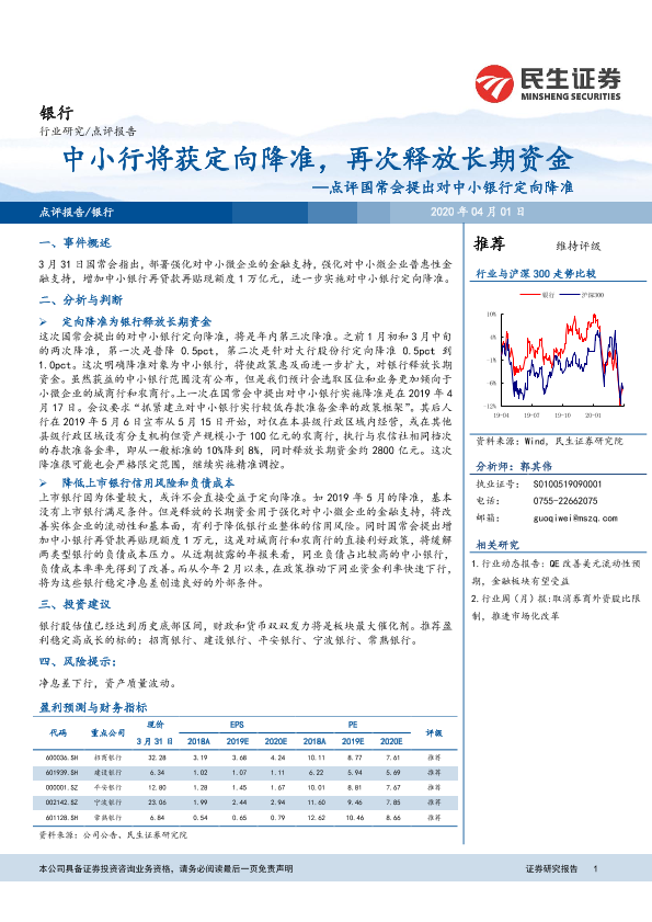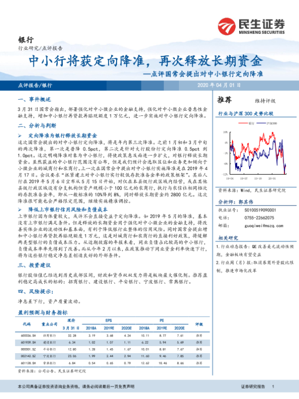 【民生证券】【20200401】点评国常会提出对中小银行定向降准:中小行将获定向降准,再次释放长期资金-5页