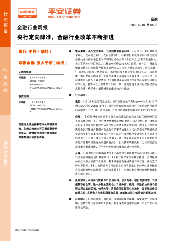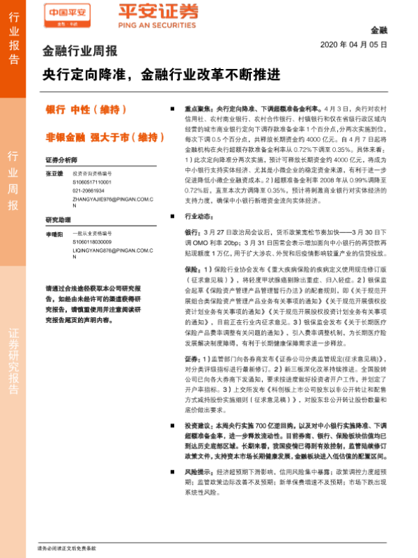 【平安证券】【20200405】金融行业周报:央行定向降准,金融行业改革不断推进-7页