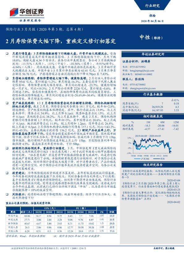 【华创证券】【20200406】保险行业3月月报:2月寿险保费大幅下降,重疾定义修订初落定-19页