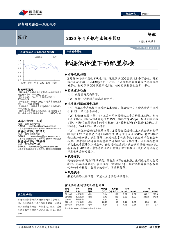 【国信证券】【20200406】2020年4月银行业投资策略:把握低估值下的配置机会-8页