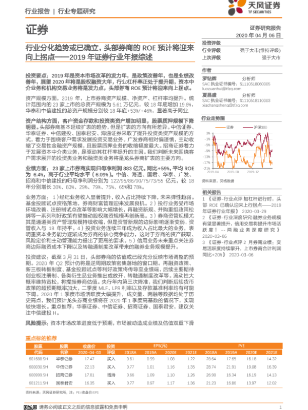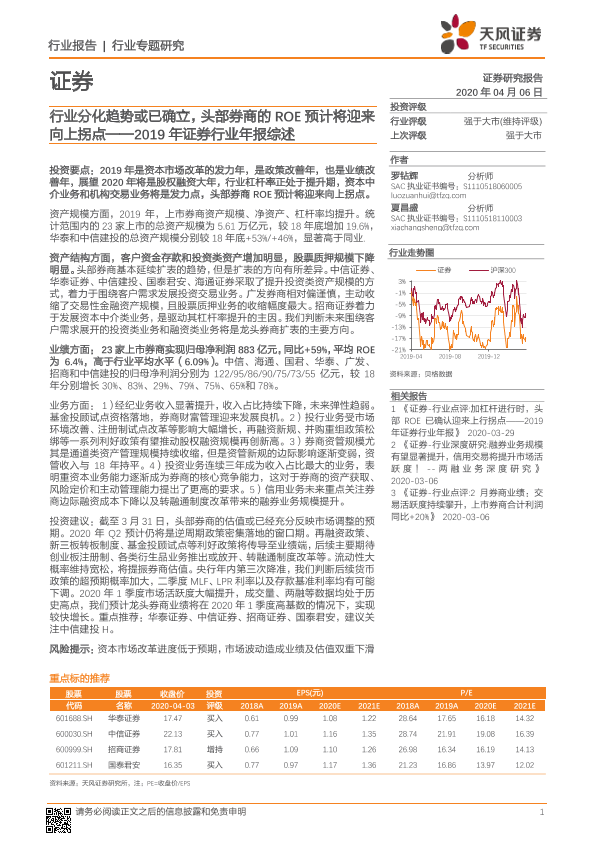 【天风证券】【20200406】2019年证券行业年报综述:行业分化趋势或已确立,头部券商的ROE预计将迎来向上拐点-19页