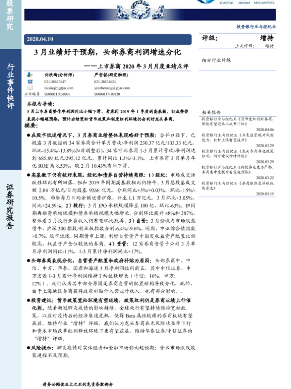 【国泰君安证券】【20200410】上市券商2020年3月月度业绩点评:3月业绩好于预期,头部券商利润增速分化-4页