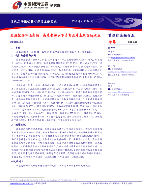 【银河证券】【20200410】非银行金融行业:交投数据环比走弱,高基数影响下券商业绩表现有所承压-3页