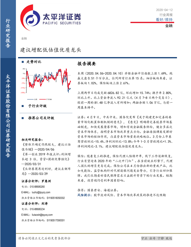 【太平洋证券】【20200412】金融行业周报:建议增配低估值优质龙头-12页