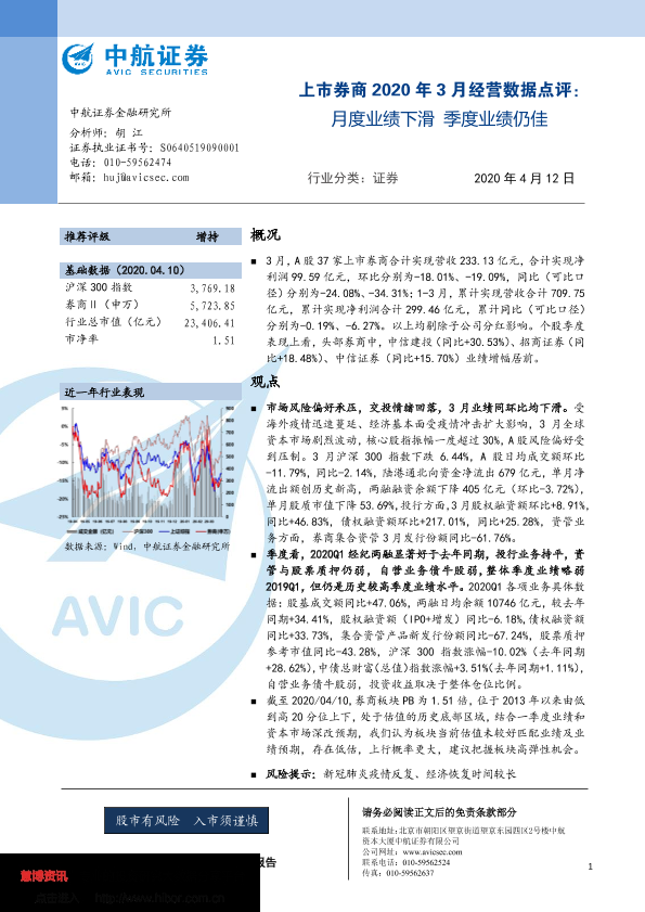 【中航证券】【20200412】上市券商2020年3月经营数据点评:月度业绩下滑季度业绩仍佳-5页