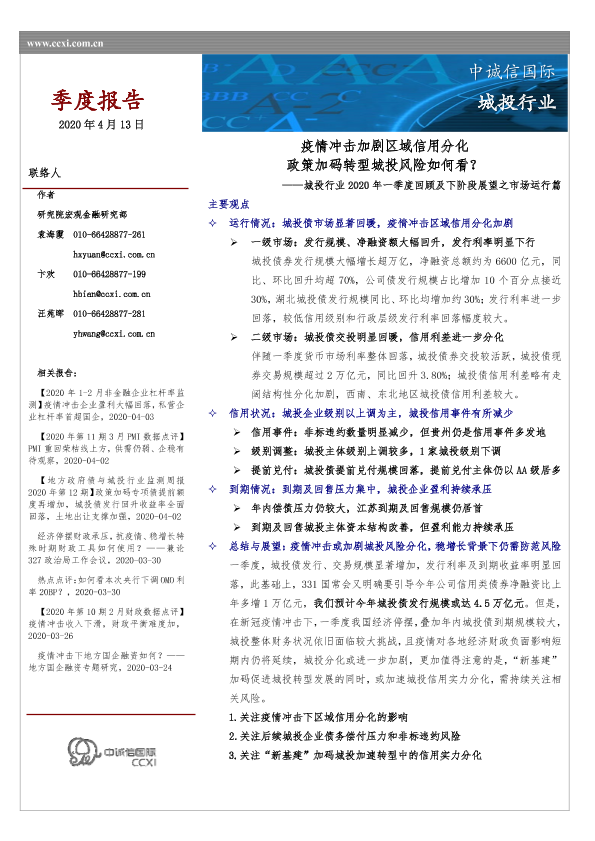 【中诚信国际】【20200413】城投行业2020年一季度回顾及下阶段展望之市场运行篇:疫情冲击加剧区域信用分化 政策加码转型城投风险如何看?-2页