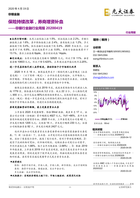 【光大证券】【20200419】非银行金融行业周报:保险持续改革,券商增资补血-15页