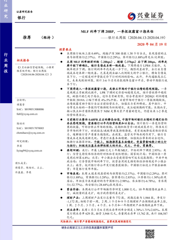 【兴业证券】【20200419】MLF利率下调20BP,一季报披露窗口期来临-12页