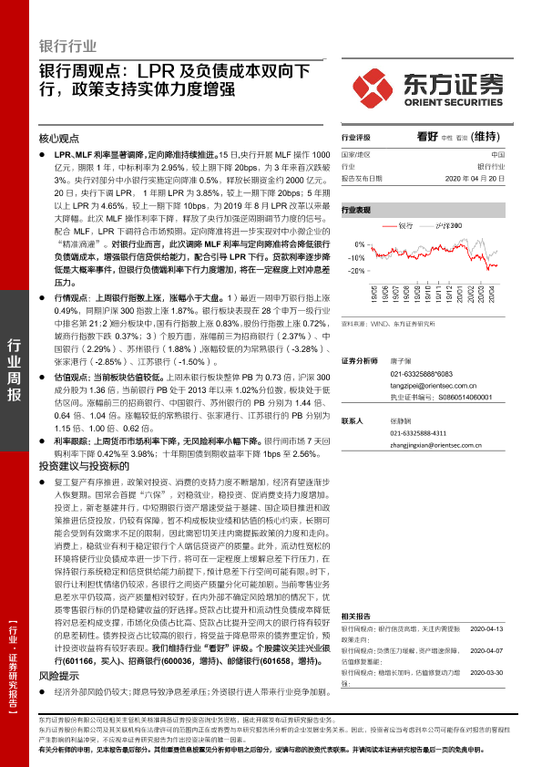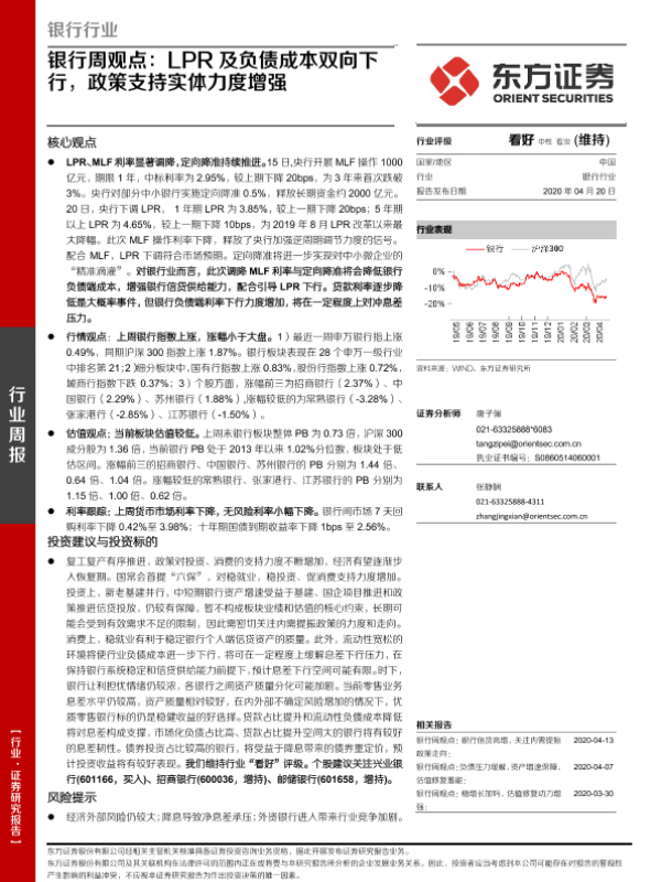 【东方证券】【20200420】银行周观点:LPR及负债成本双向下行,政策支持实体力度增强-14页