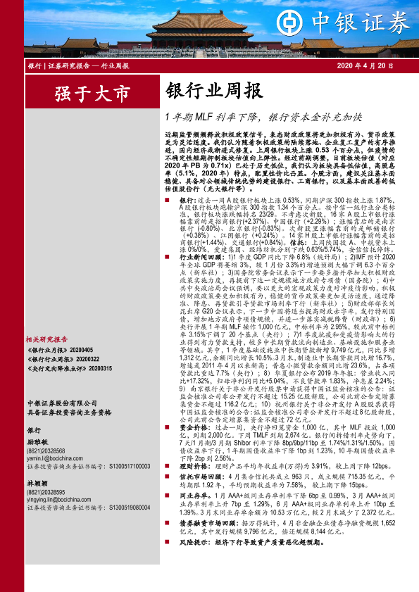 【中银证券】【20200420】1年期MLF利率下降,银行资本金补充加快-15页