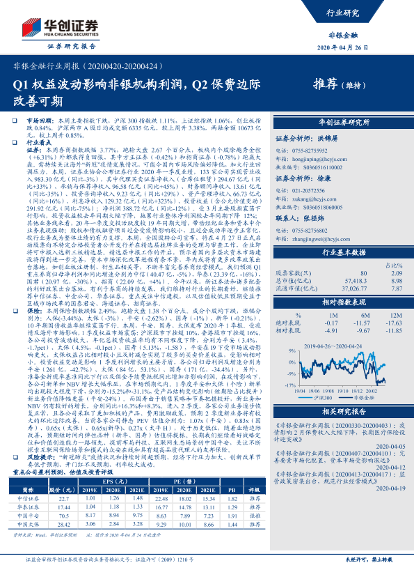 【华创证券】【20200426】非银金融行业周报:Q1权益波动影响非银机构利润,Q2保费边际改善可期-17页