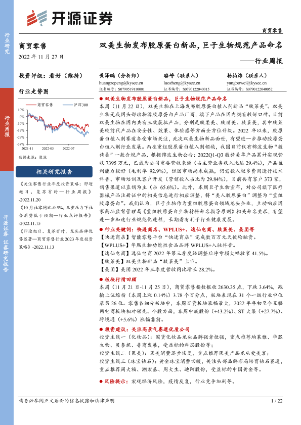 【开源证券】【20221127】商贸零售行业周报:双美生物发布胶原蛋白新品,巨子生物规范产品命名-22页