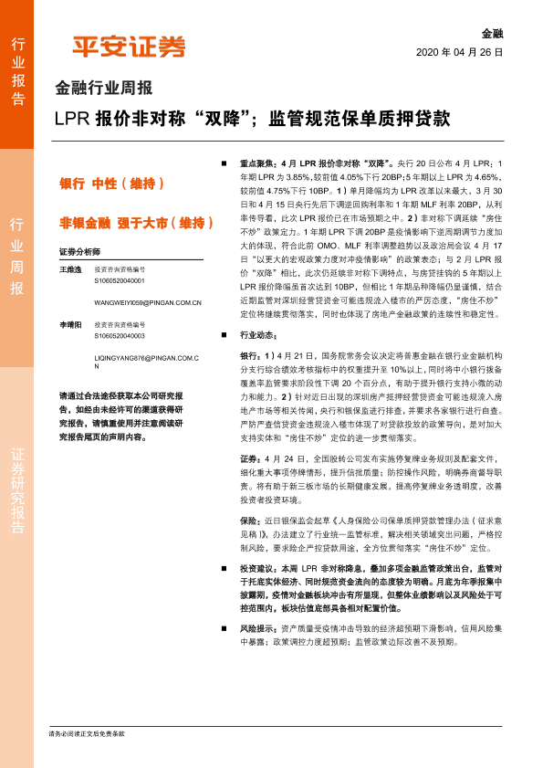 【平安证券】【20200426】金融行业周报:LPR报价非对称“双降”;监管规范保单质押贷款-7页