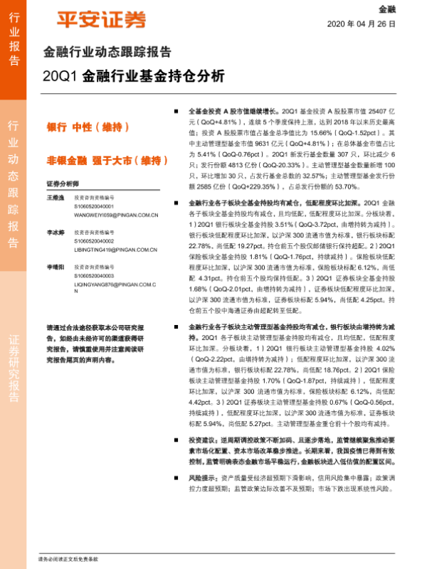 【平安证券】【20200426】20Q1金融行业基金持仓分析-10页