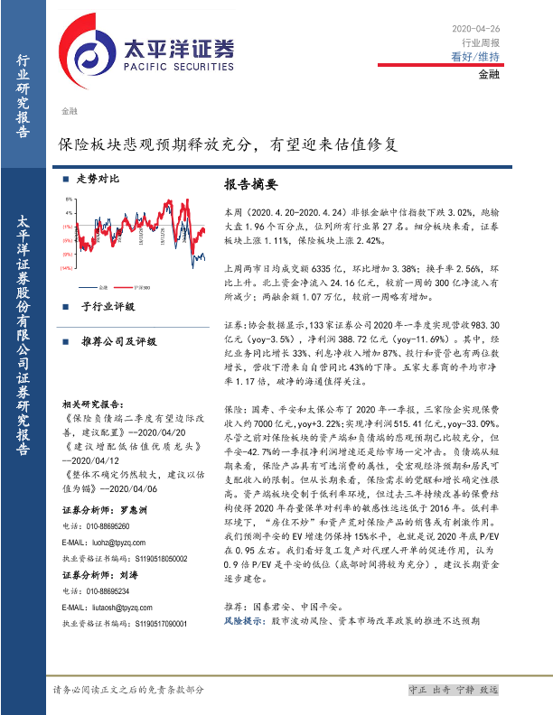 【太平洋证券】【20200426】金融行业周报:保险板块悲观预期释放充分,有望迎来估值修复-12页