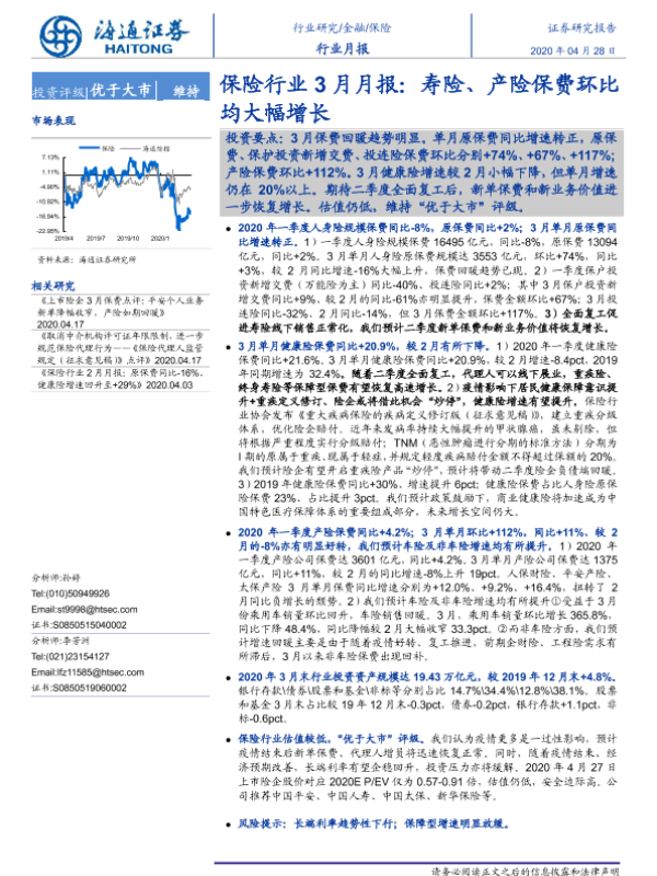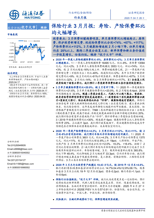 【海通证券】【20200428】保险行业3月月报:寿险、产险保费环比均大幅增长-5页