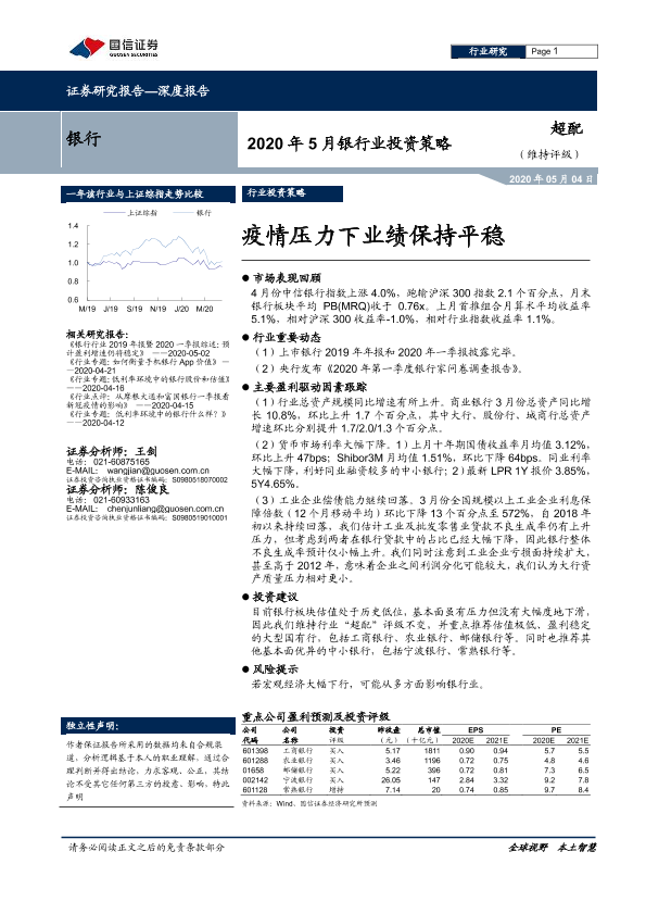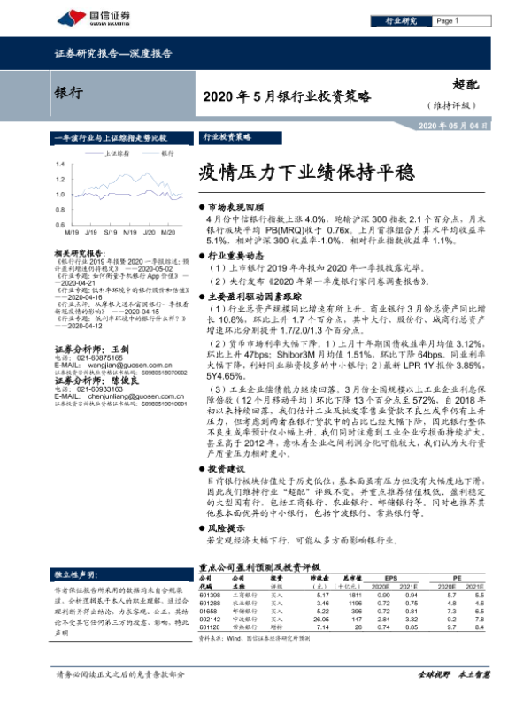 【国信证券】【20200504】2020年5月银行业投资策略:疫情压力下业绩保持平稳-9页