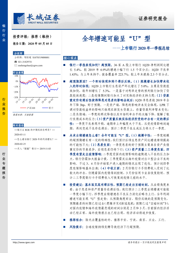 【长城证券】【20200505】上市银行2020年一季报总结:全年增速可能呈“U”型-9页