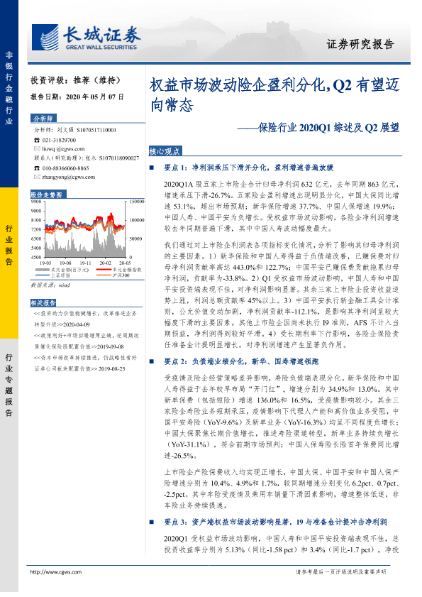 【长城证券】【20200507】保险行业2020Q1综述及Q2展望:权益市场波动险企盈利分化,Q2有望迈向常态-14页