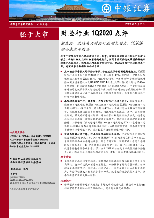 【中银证券】【20200507】财险行业1Q2020点评:健康险、农险成为财险行业增长动力,1Q2020综合成本率改善-7页
