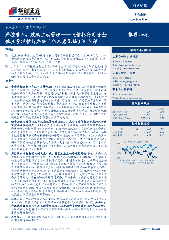 【华创证券】【20200510】多元金融行业重大事项点评:《信托公司资金信托管理暂行办法(征求意见稿)》点评——严控非标,鼓励主动管理-4页