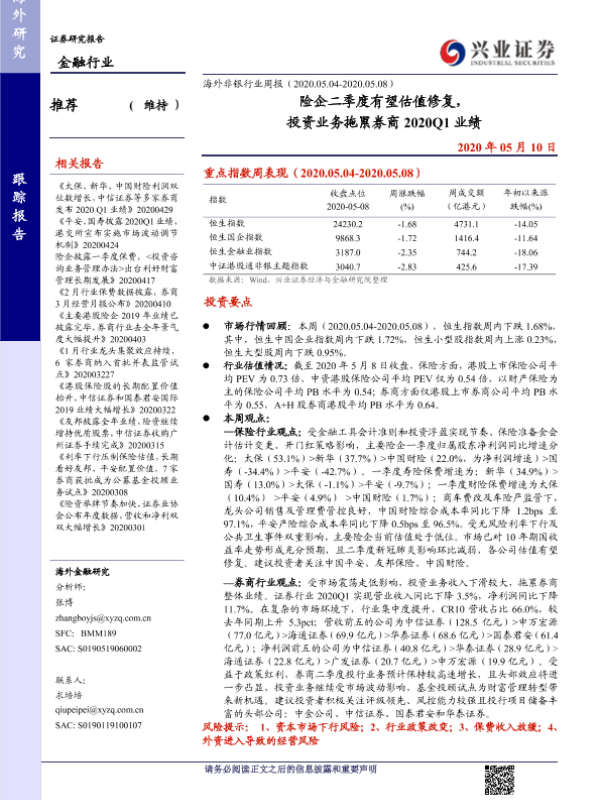 【兴业证券】【20200510】海外非银行业周报:险企二季度有望估值修复,投资业务拖累券商2020Q1业绩-38页
