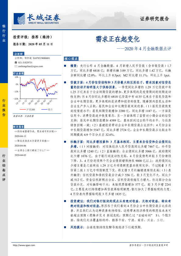 【长城证券】【20200511】银行行业2020年4月金融数据点评:需求正在起变化-5页