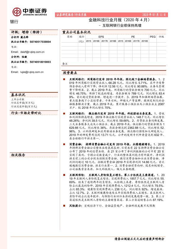 【中泰证券】【20200511】金融科技行业月报:互联网银行业绩保持高增-17页
