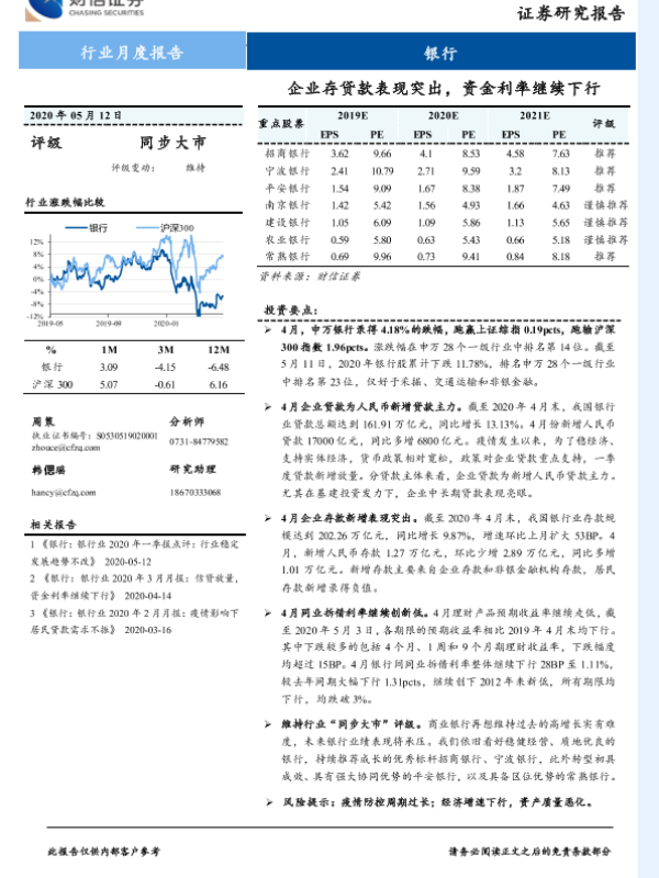 【财信证券】【20200512】银行行业月度报告:企业存贷款表现突出,资金利率继续下行-9页