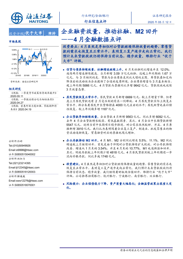 【海通证券】【20200512】4月金融数据点评:企业融资放量,推动社融、M2回升-3页