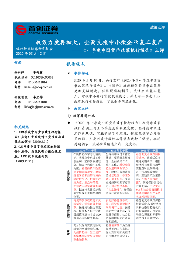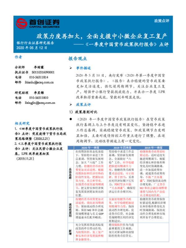 【首创证券】【20200512】一季度中国货币政策执行报告点评:政策力度再加大,全面支援中小微企业复工复产-5页