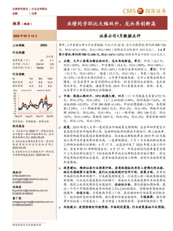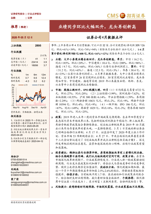 【海通证券】【20200512】证券公司4月数据点评:业绩同步环比大幅双升,龙头再创新高-4页