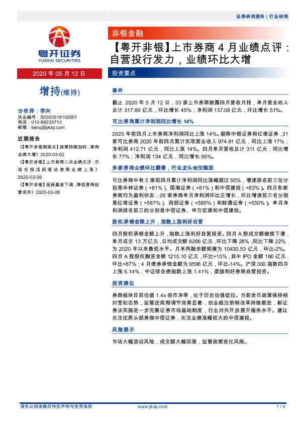 【粤开证券】【20200512】上市券商4月业绩点评:自营投行发力,业绩环比大增-4页