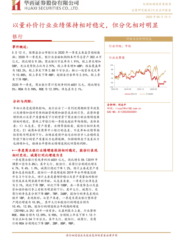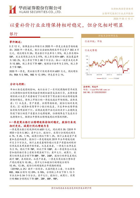 【华西证券】【20200513】银行业点评报告:以量补价行业业绩保持相对稳定,但分化相对明显-4页