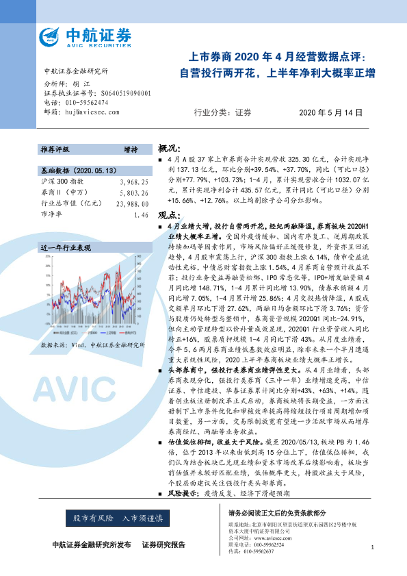 【中航证券】【20200514】上市券商2020年4月经营数据点评:自营投行两开花,上半年净利大概率正增-5页