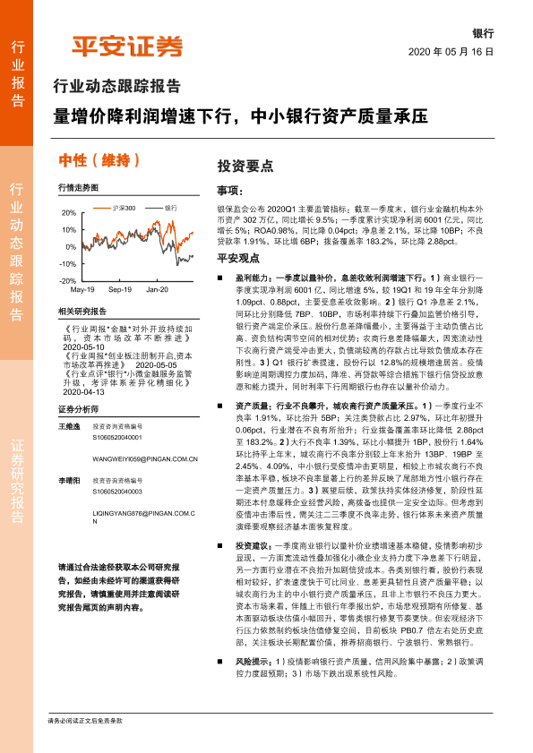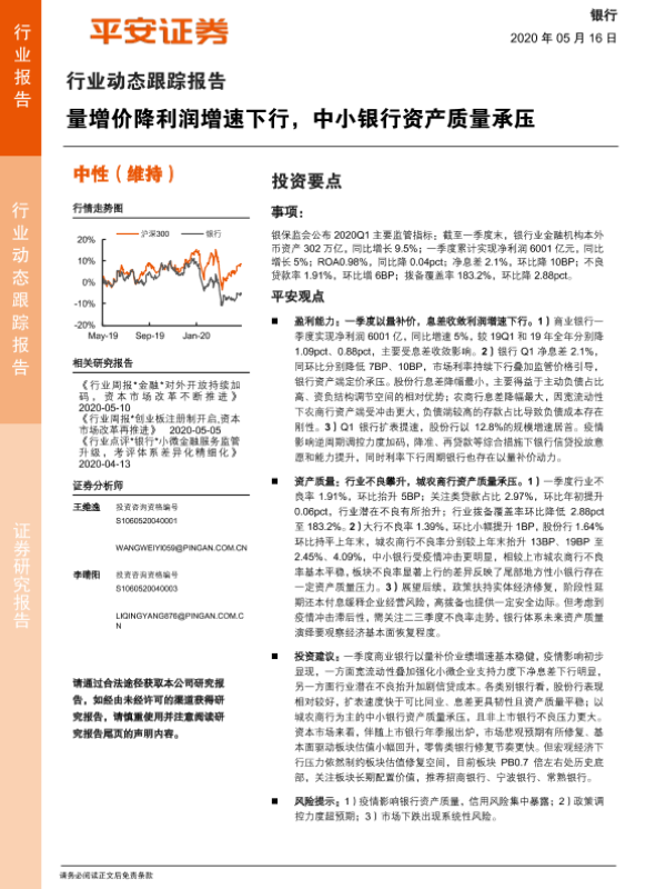 【平安证券】【20200516】银行行业动态跟踪报告:量增价降利润增速下行,中小银行资产质量承压-7页