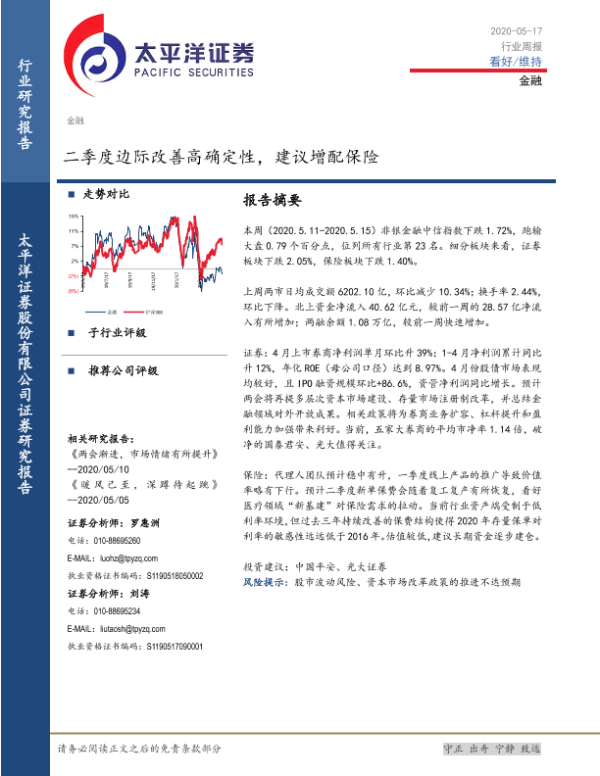 【太平洋证券】【20200517】金融行业周报:二季度边际改善高确定性,建议增配保险-11页