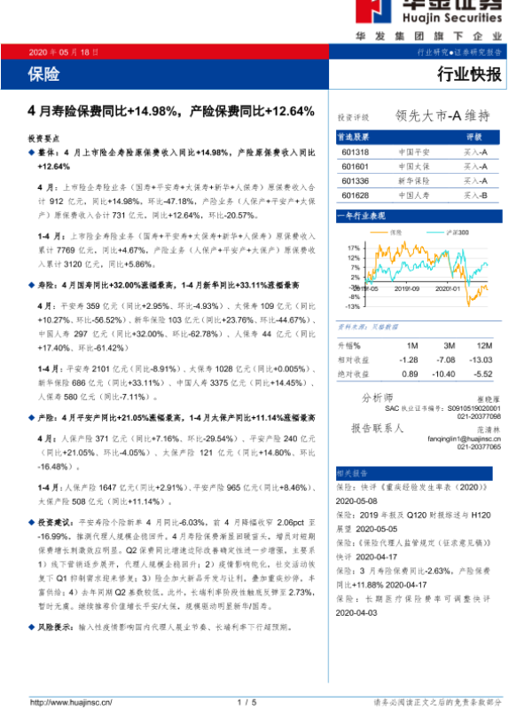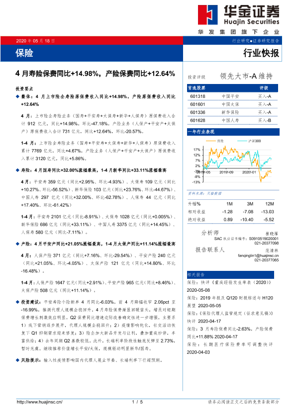 【华金证券】【20200518】4月寿险保费同比+14.98%,产险保费同比+12.64%-5页