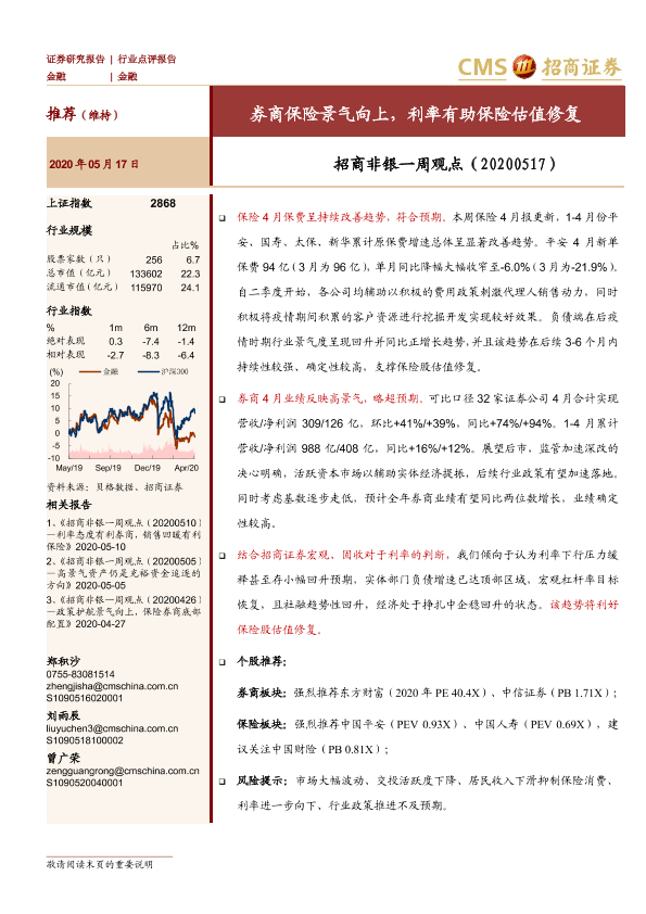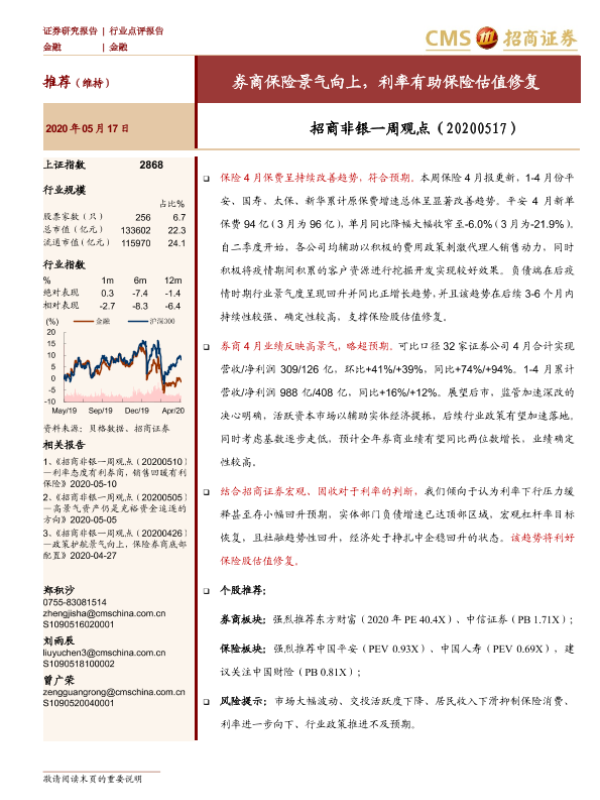 【海通证券】【20200517】招商非银一周观点:券商保险景气向上,利率有助保险估值修复-8页