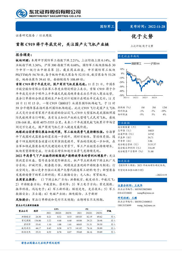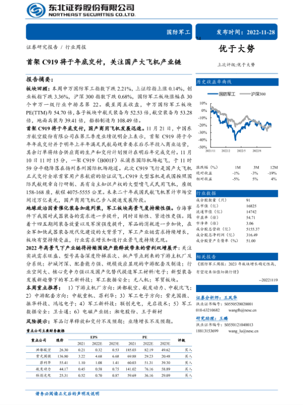 【东北证券】【20221128】国防军工行业周报:首架C919将于年底交付,关注国产大飞机产业链-21页
